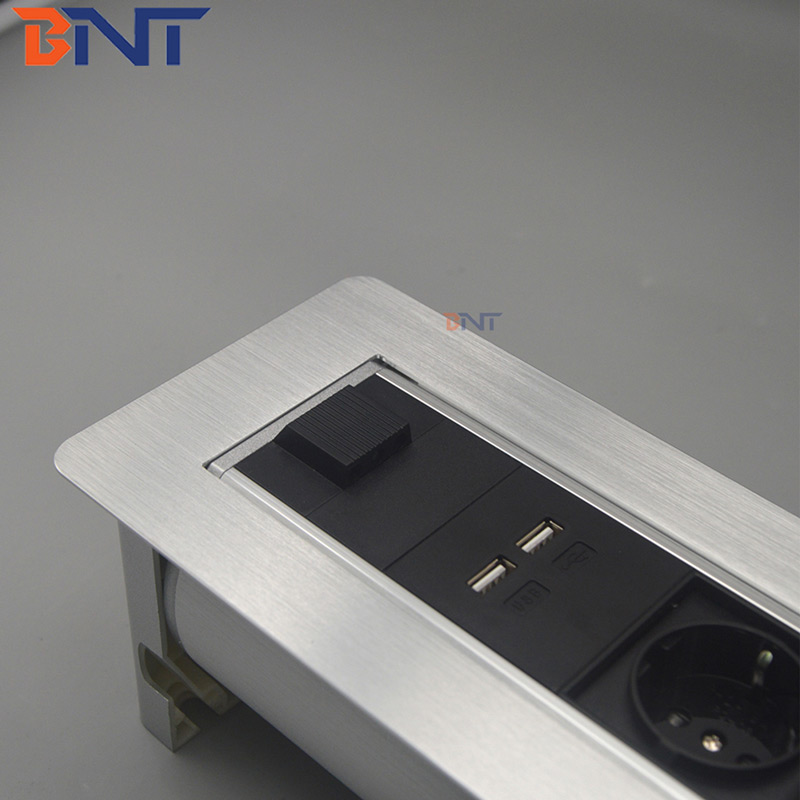 EK6308EU table top socket is a high quality full aluminum alloy motorized flip table top socket box with 4*EU outlet +2*USB Charger configuration, it can be hidden into the table to anti-electric shock and save the space.When someone wants to use the socket, just to press the switch control, the socket panel will automatically 180 degree roate from the table, then the socket is exposed to the tabletop for use. When it is unuse, it is closed by 180 degree roatation to flush with the desktop.