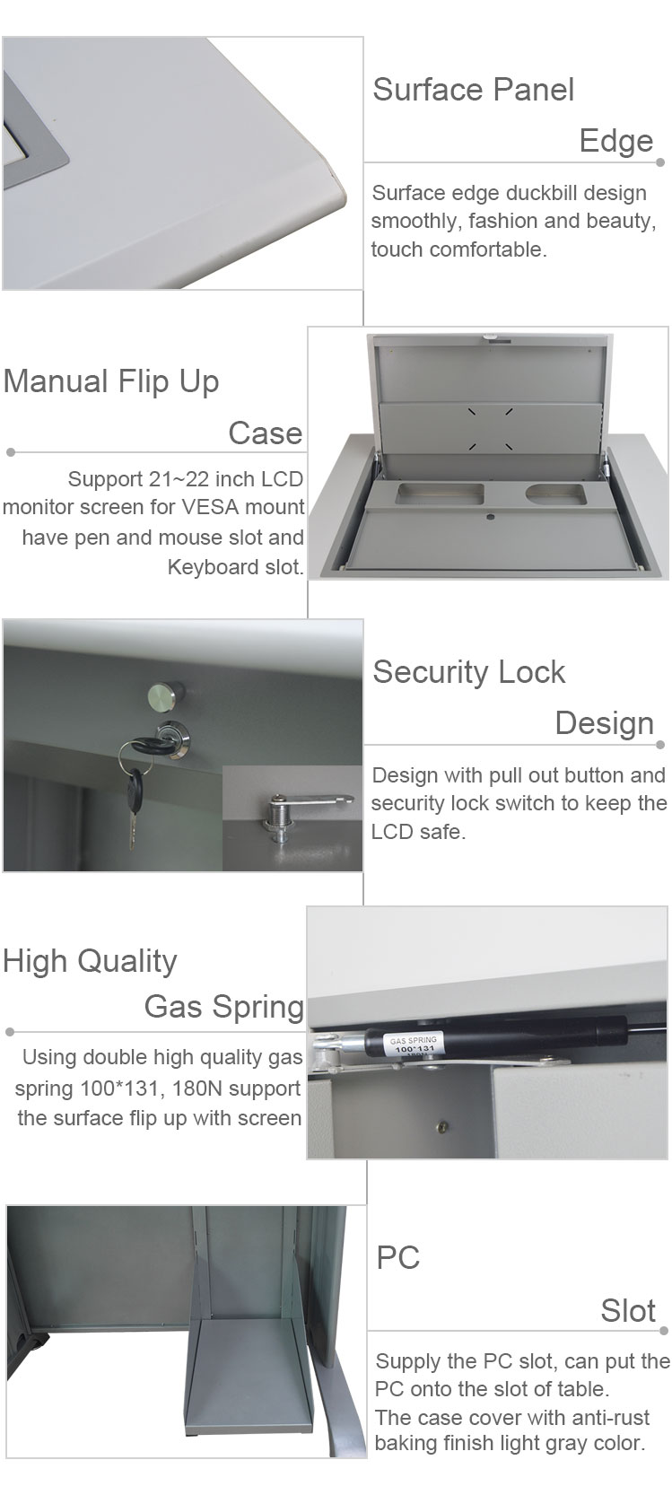 Monitor Sreen Flip up security case is widely used on furniture, like computer desk, office desk, conference table, meeting table and lecture and training room